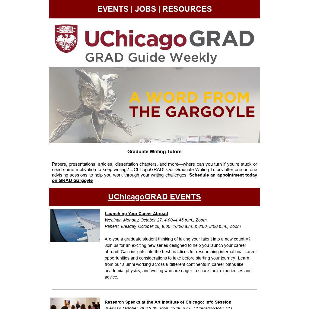 Papers, presentations, articles, dissertation chapters, and more—where can you turn if you’re stuck or need some motivation to keep writing? UChicagoGRAD! Our Graduate Writing Tutors offer one-on-one advising sessions to help you work through your writing challenges. Schedule an appointment today on GRAD Gargoyle.