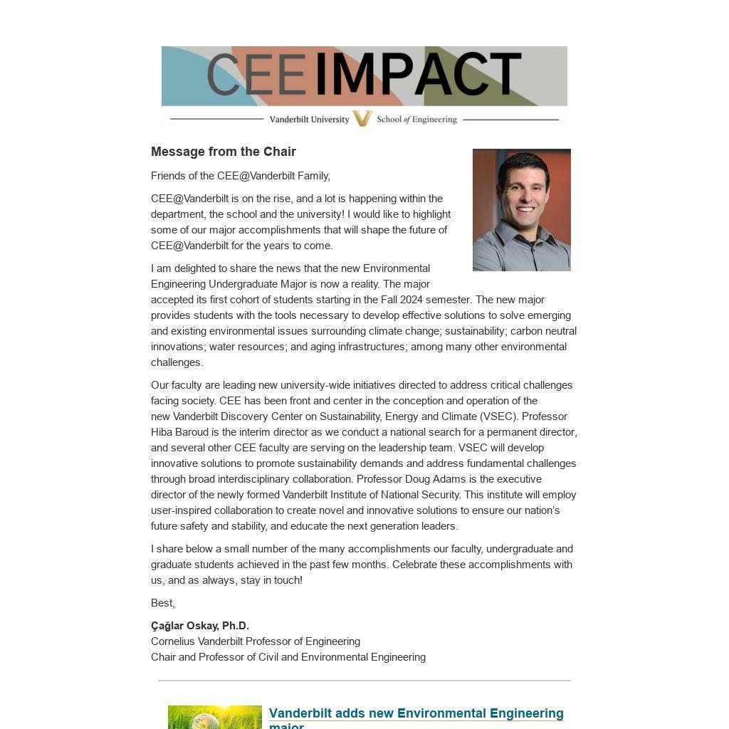 CEE@Vanderbilt is on the rise, and a lot is happening within the department, the school and the university! I would like to highlight some of our major accomplishments that will shape the future of CEE@Vanderbilt for the years to come.