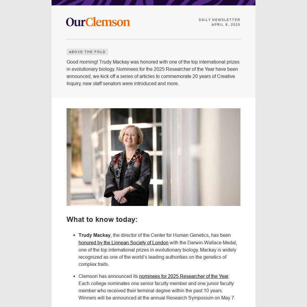 Good morning! Trudy Mackay was honored with one of the top international prizes in evolutionary biology. Nominees for the 2025 Researcher of the Year have been announced, we kick off a series of articles to commemorate 20 years of Creative Inquiry, new staff senators were introduced and more.