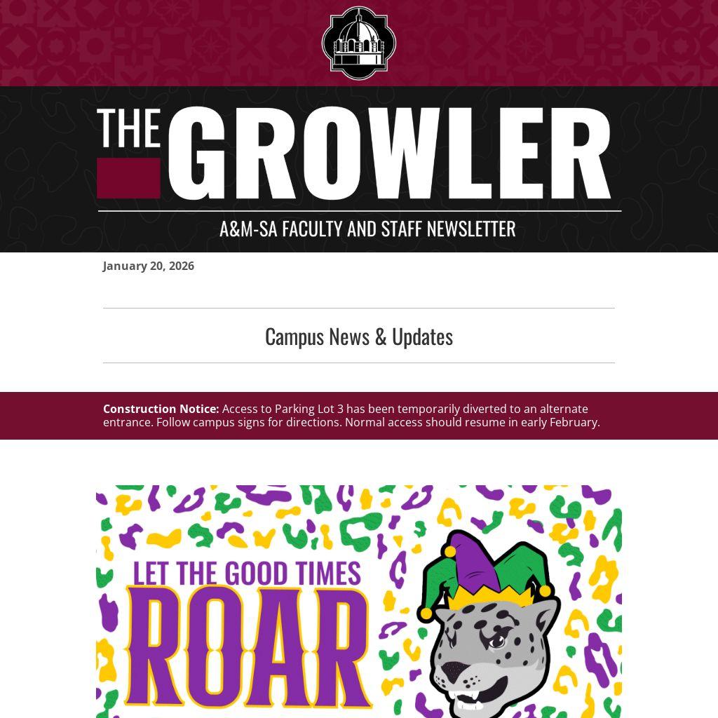 The Growler is the campus newsletter for faculty and staff of Texas A&M-San Antonio. The Growler is published every Tuesday from the start of the semester, providing insight into A&M-SA news, events, and announcements. If you would like to promote a University-wide event or announcement in The Growler, submit this form by 5 p.m. CT on a Monday the week before publication.