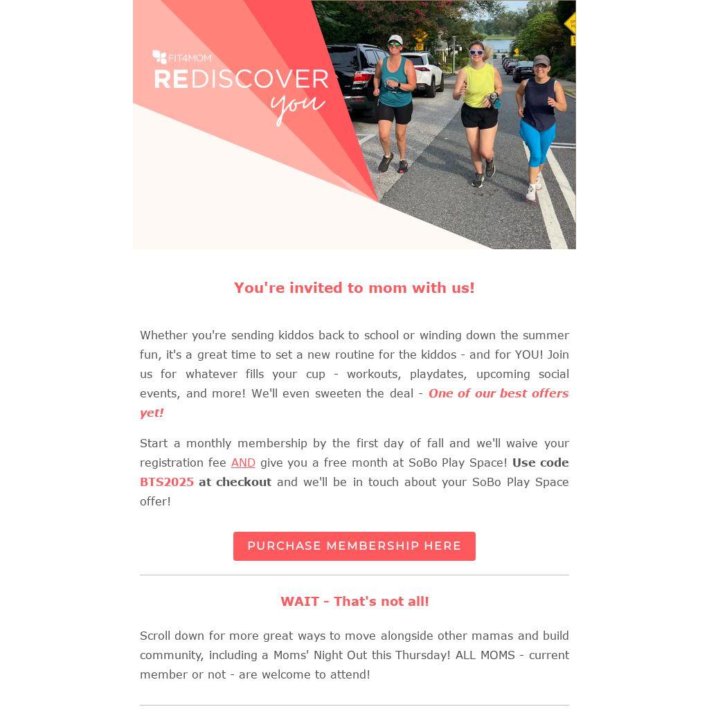 Whether you're sending kiddos back to school or winding down the summer fun, it's a great time to set a new routine for the kiddos - and for YOU! Join us for whatever fills your cup - workouts, playdates, upcoming social events, and more! We'll even sweeten the deal - One of our best offers yet!