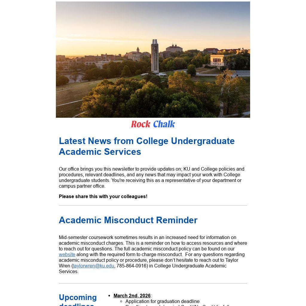 Our office brings you this newsletter to provide updates on; KU and College policies and procedures, relevant deadlines, and any news that may impact your work with College undergraduate students. You're receiving this as a representative of your department or campus partner office.