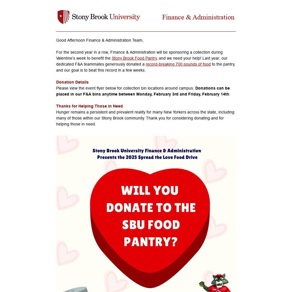 For the second year in a row, Finance & Administration will be sponsoring a collection during Valentine’s week to benefit the Stony Brook Food Pantry, and we need your help! Last year, our dedicated F&A teammates generously donated a record-breaking 700 pounds of food to the pantry, and our goal is to beat this record in a few weeks.