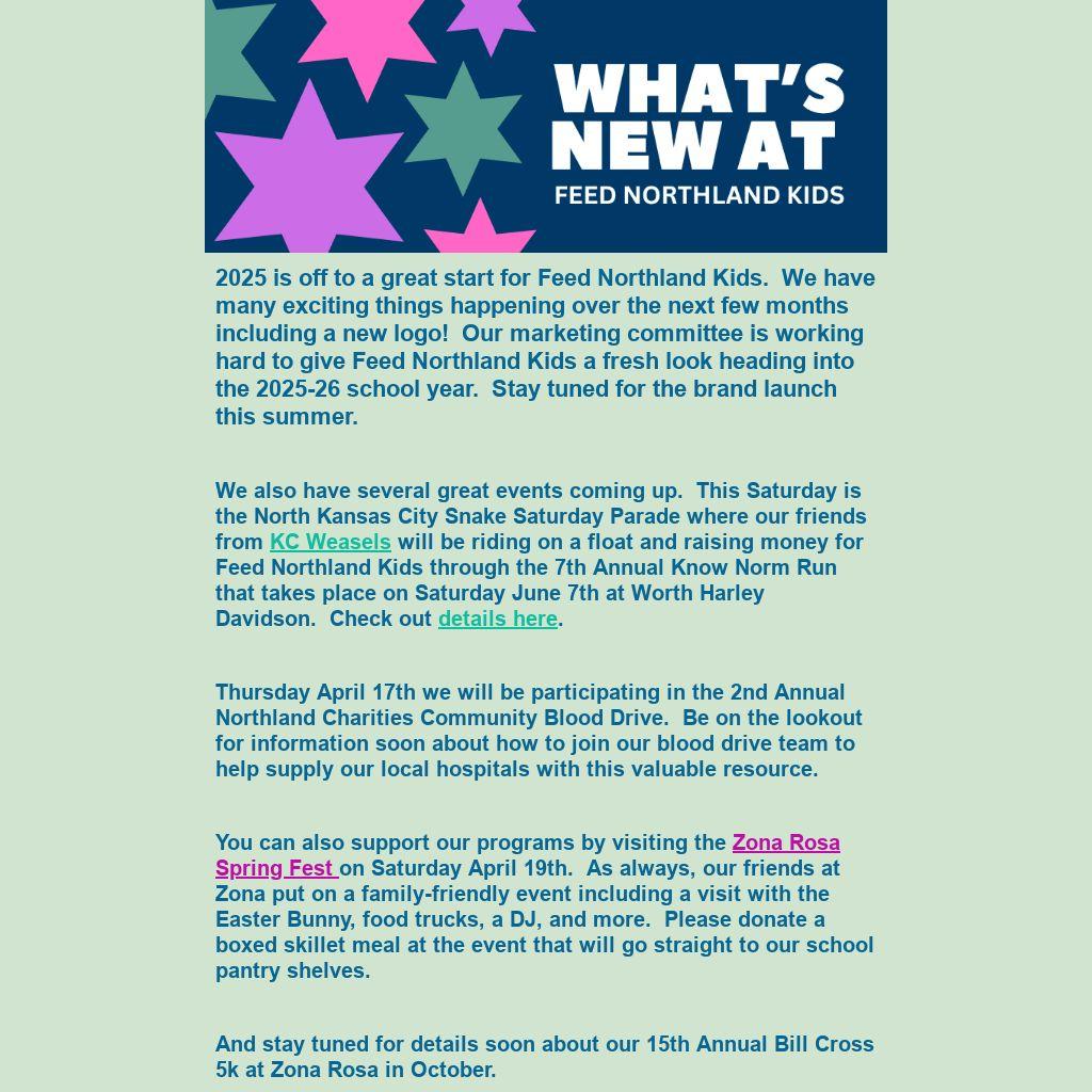 2025 is off to a great start for Feed Northland Kids. We have many exciting things happening over the next few months including a new logo! Our marketing committee is working hard to give Feed Northland Kids a fresh look heading into the 2025-26 school year. Stay tuned for the brand launch this summer. |