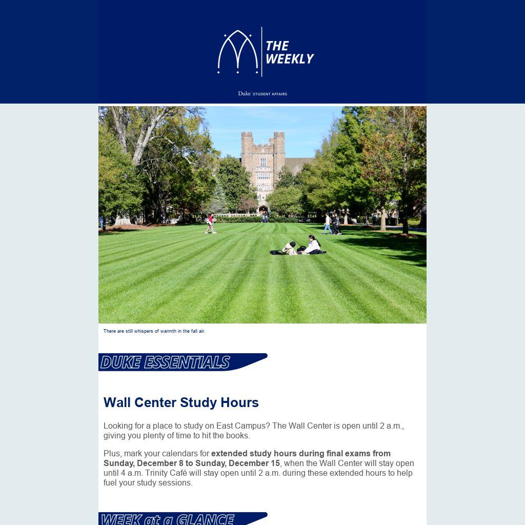 Plus, mark your calendars for extended study hours during final exams from Sunday, December 8 to Sunday, December 15, when the Wall Center will stay open until 4 a.m. Trinity Café will stay open until 2 a.m. during these extended hours to help fuel your study sessions.