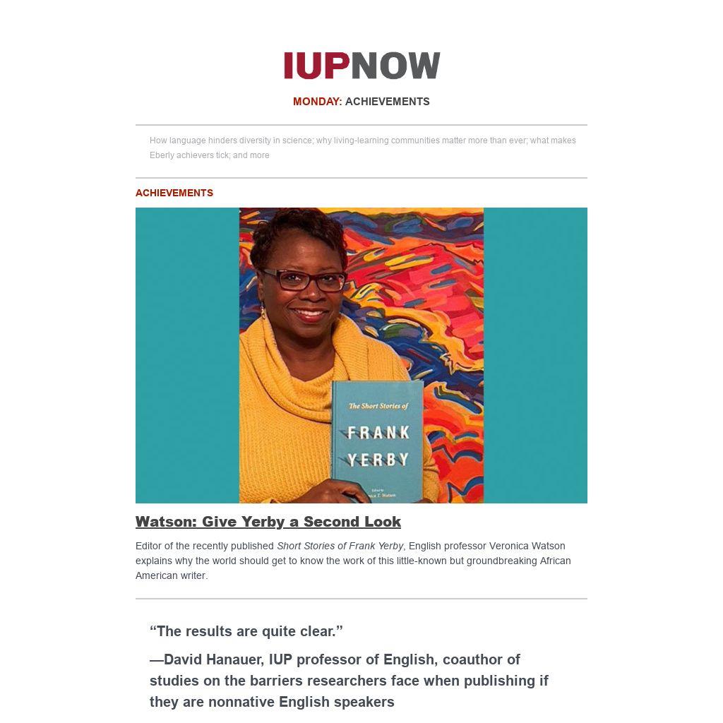 Distributed to IUP employees and students four days a week, IUP Now is the official newsletter of Indiana University of Pennsylvania. It features news from across the IUP website, compiled by the Division of Marketing and Communications. Find out how to get your news and events in IUP Now.