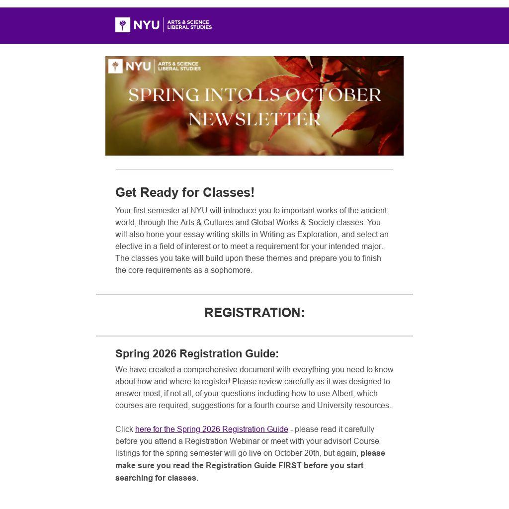 Spring 2026 Class Registration Webinar:Register for and attend one of our live Class Registration Webinars (schedule below) to hear about key steps for choosing and enrolling in your spring classes. Be sure to register and save the date for the correct webinar based on your academic advisor and advising group. A list of the dates and times for the webinars follows. If needed, you can check your academic advisor in NYU Connect.