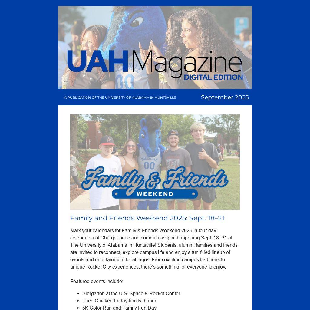 Mark your calendars for Family & Friends Weekend 2025, a four-day celebration of Charger pride and community spirit happening Sept. 18–21 at The University of Alabama in Huntsville! Students, alumni, families and friends are invited to reconnect, explore campus life and enjoy a fun-filled lineup of events and entertainment for all ages. From exciting campus traditions to unique Rocket City experiences, there’s something for everyone to enjoy.