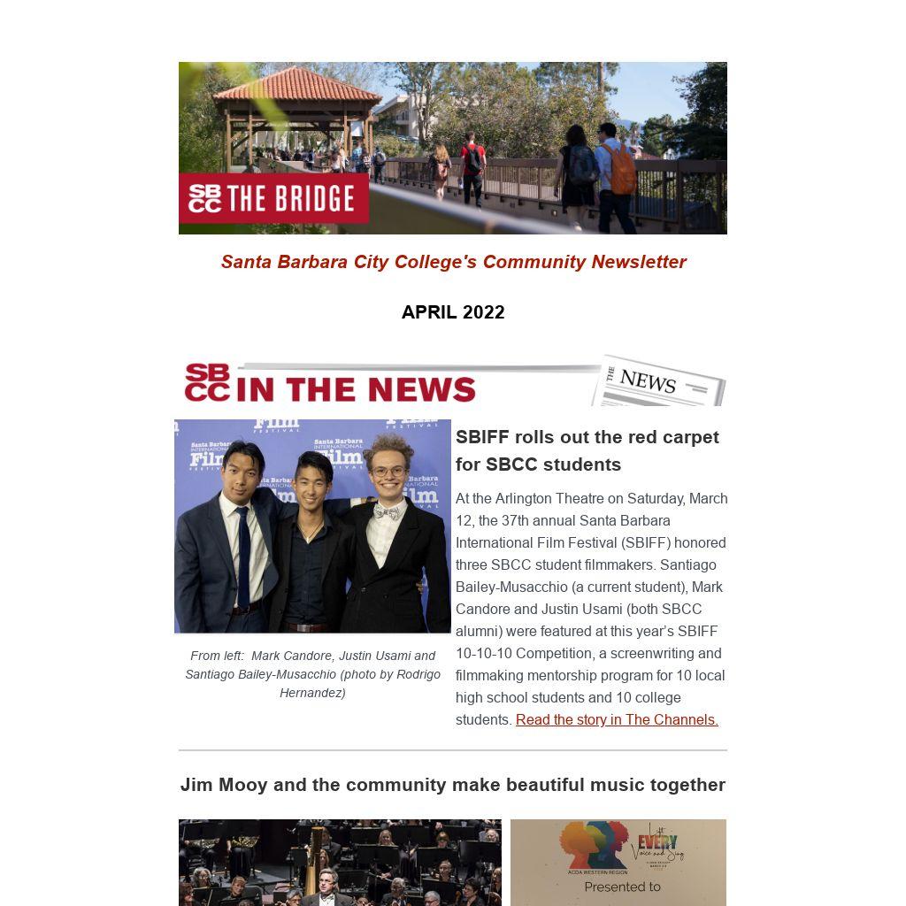 At the Arlington Theatre on Saturday, March 12, the 37th annual Santa Barbara International Film Festival (SBIFF) honored three SBCC student filmmakers. Santiago Bailey-Musacchio (a current student), Mark Candore and Justin Usami (both SBCC alumni) were featured at this year’s SBIFF 10-10-10 Competition, a screenwriting and filmmaking mentorship program for 10 local high school students and 10 college students. Read the story in The Channels.