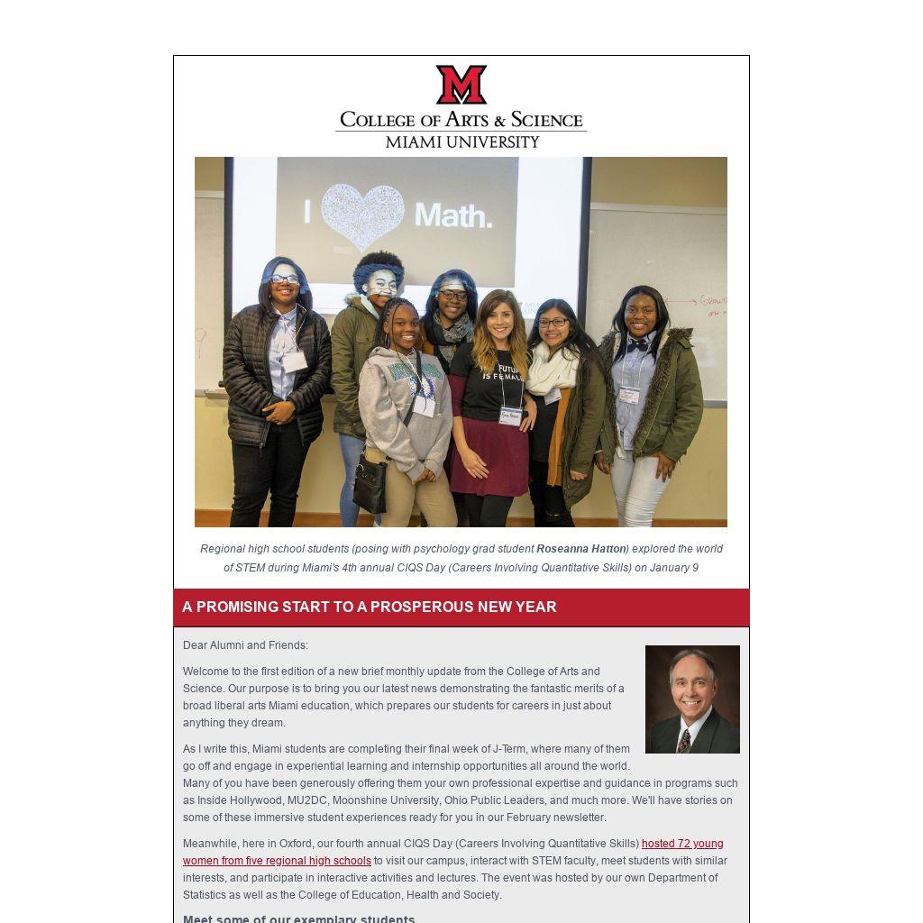 Welcome to the first edition of a new brief monthly update from the College of Arts and Science. Our purpose is to bring you our latest news demonstrating the fantastic merits of a broad liberal arts Miami education, which prepares our students for careers in just about anything they dream.