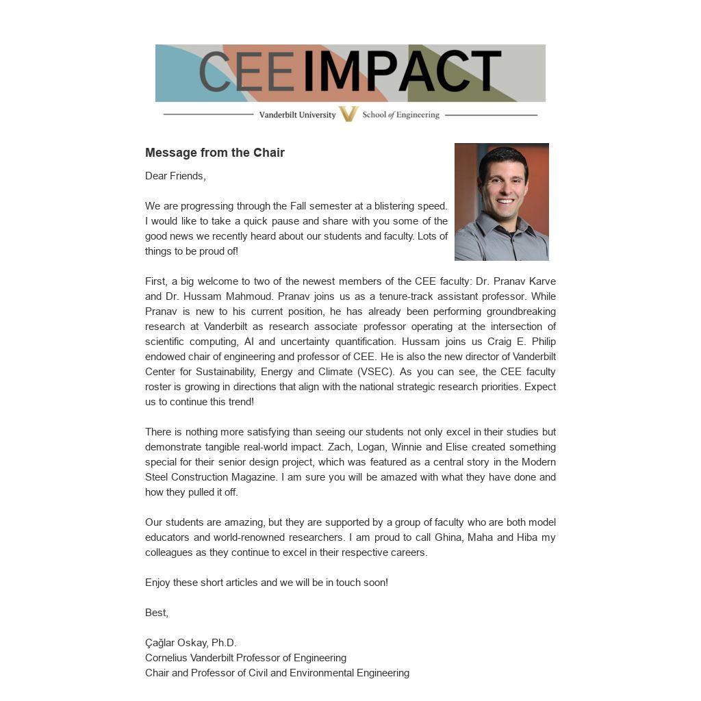 First, a big welcome to two of the newest members of the CEE faculty: Dr. Pranav Karve and Dr. Hussam Mahmoud. Pranav joins us as a tenure-track assistant professor. While Pranav is new to his current position, he has already been performing groundbreaking research at Vanderbilt as research associate professor operating at the intersection of scientific computing, AI and uncertainty quantification. Hussam joins us Craig E. Philip endowed chair of engineering and professor of CEE. He is also the new director of Vanderbilt Center for Sustainability, Energy and Climate (VSEC). As you can see, the CEE faculty roster is growing in directions that align with the national strategic research priorities. Expect us to continue this trend!