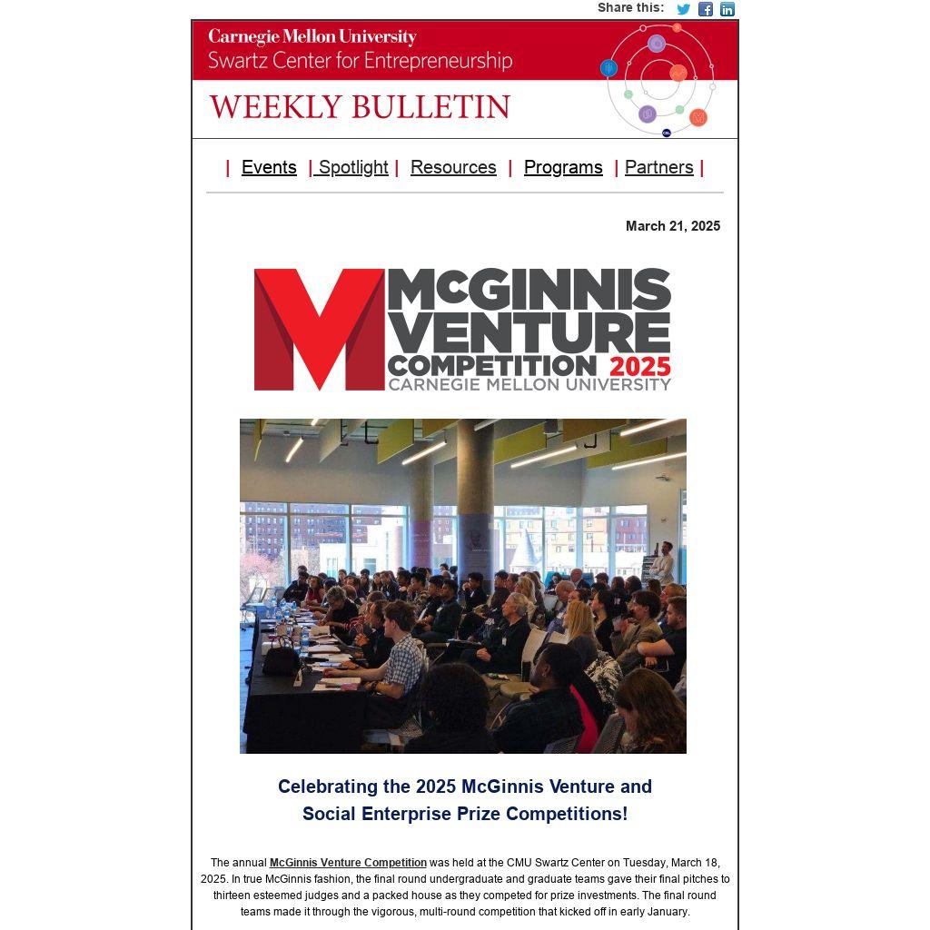 Have startup news or opportunities to share? Have questions about the Swartz Center Weekly Bulletin? Send news, opportunities or questions to Sonya Ford, Program Manager.