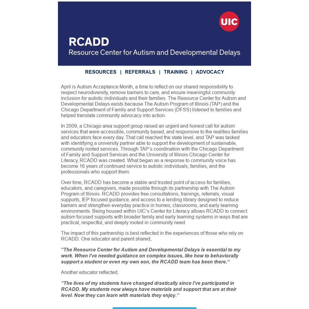 In 2009, a Chicago area support group raised an urgent and honest call for autism services that were accessible, community based, and responsive to the realities families and educators face every day. That call reached the state level, and TAP was tasked with identifying a university partner able to support the development of sustainable, community rooted services. Through TAP’s coordination with the Chicago Department of Family and Support Services and the University of Illinois Chicago Center for Literacy, RCADD was created. What began as a response to community voice has become 16 years of continued service to autistic individuals, families, and the professionals who support them.