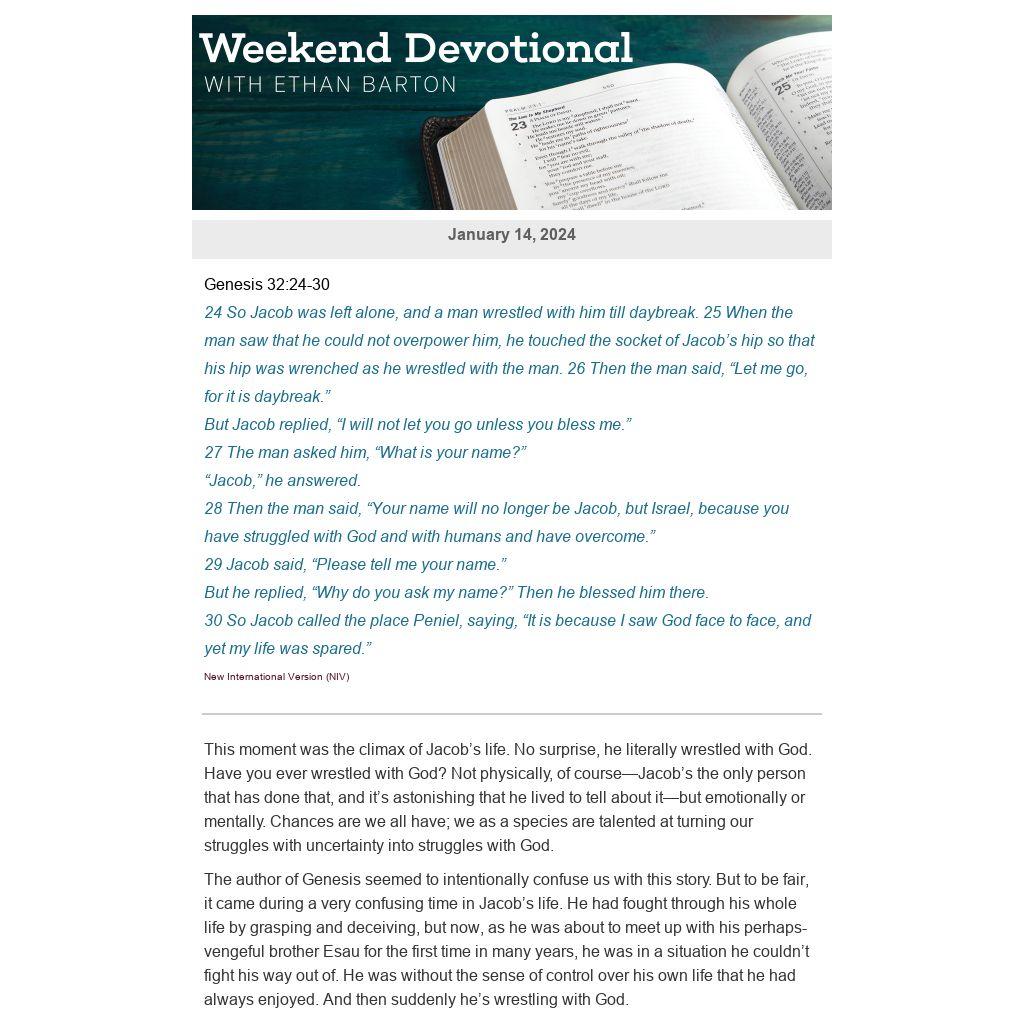 This moment was the climax of Jacob’s life. No surprise, he literally wrestled with God. Have you ever wrestled with God? Not physically, of course—Jacob’s the only person that has done that, and it’s astonishing that he lived to tell about it—but emotionally or mentally. Chances are we all have; we as a species are talented at turning our struggles with uncertainty into struggles with God.