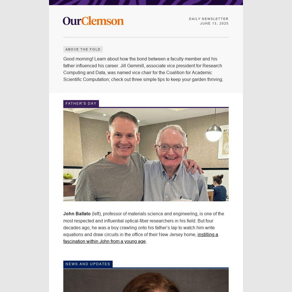 Good morning! Learn about how the bond between a faculty member and his father influenced his career. Jill Gemmill, associate vice president for Research Computing and Data, was named vice chair for the Coalition for Academic Scientific Computation; check out three simple tips to keep your garden thriving.