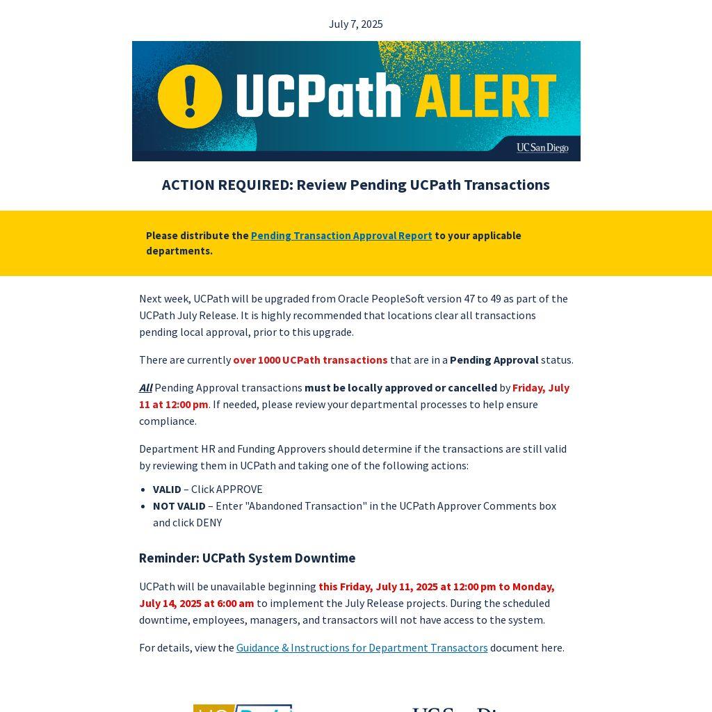 UCPath will be unavailable beginning this Friday, July 11, 2025 at 12:00 pm to Monday, July 14, 2025 at 6:00 am to implement the July Release projects. During the scheduled downtime, employees, managers, and transactors will not have access to the system.