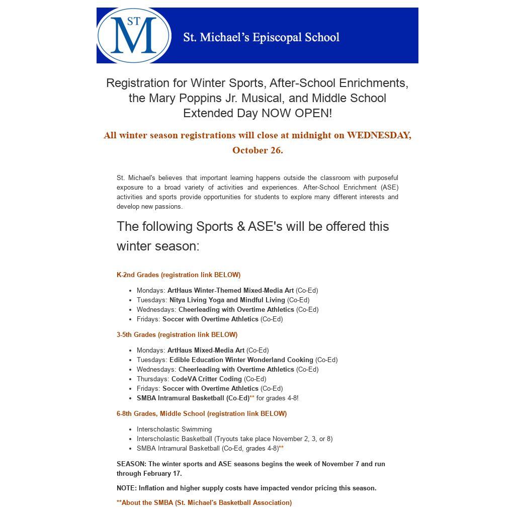 St. Michael's believes that important learning happens outside the classroom with purposeful exposure to a broad variety of activities and experiences. After-School Enrichment (ASE) activities and sports provide opportunities for students to explore many different interests and develop new passions.