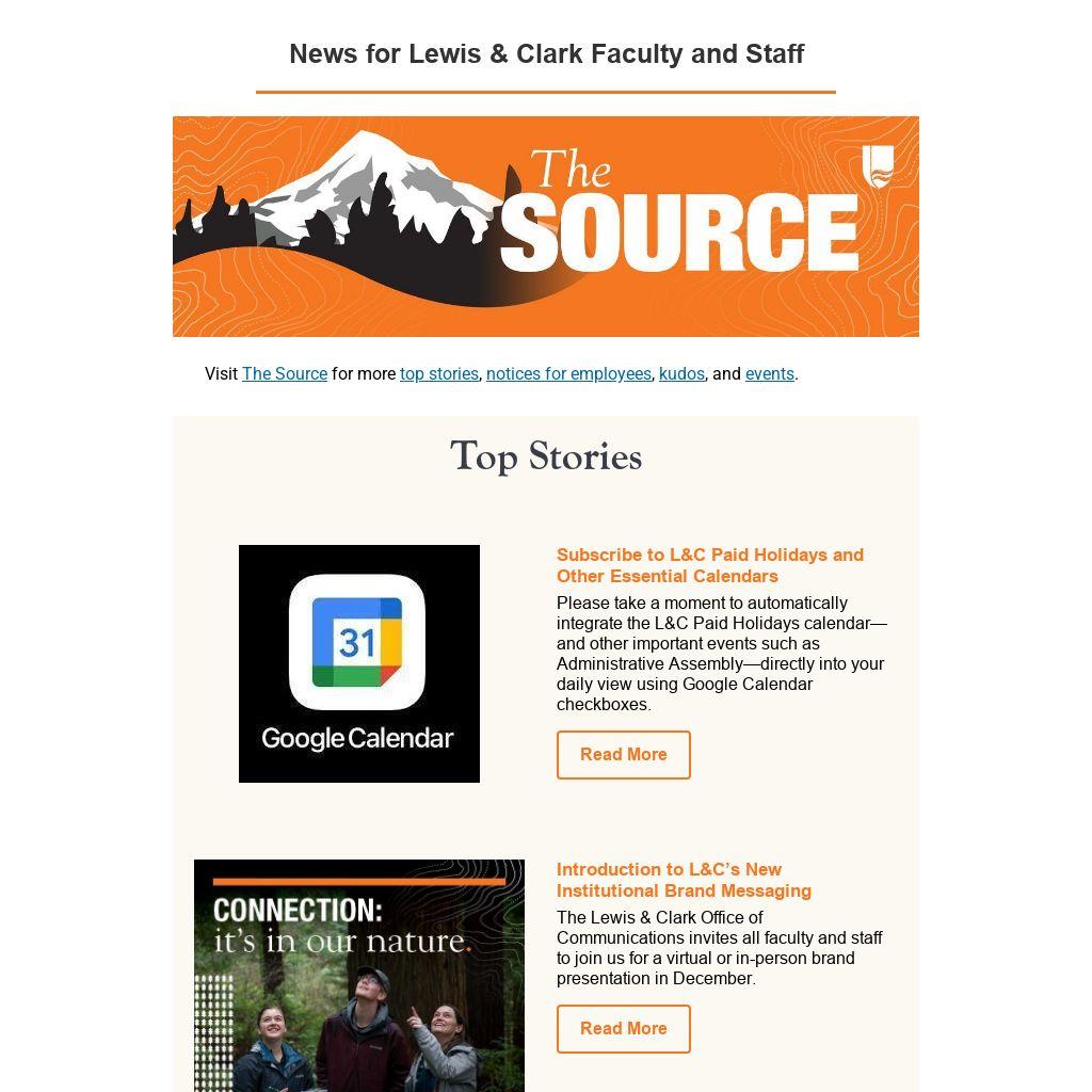 The Source is produced by Lewis & Clark's Office of Communications, and is distributed weekly to lc-employees@lclark.edu. Please write to us with your ideas, stories, and events—including specific date requests for promotion. Although there is no option for employees to unsubscribe, please do not mark this email as spam as doing so may negatively impact Lewis & Clark's reputation with Google as a trustworthy sender. Learn more about Lewis & Clark’s efforts to protect the email reputation of our lclark.edu domain.