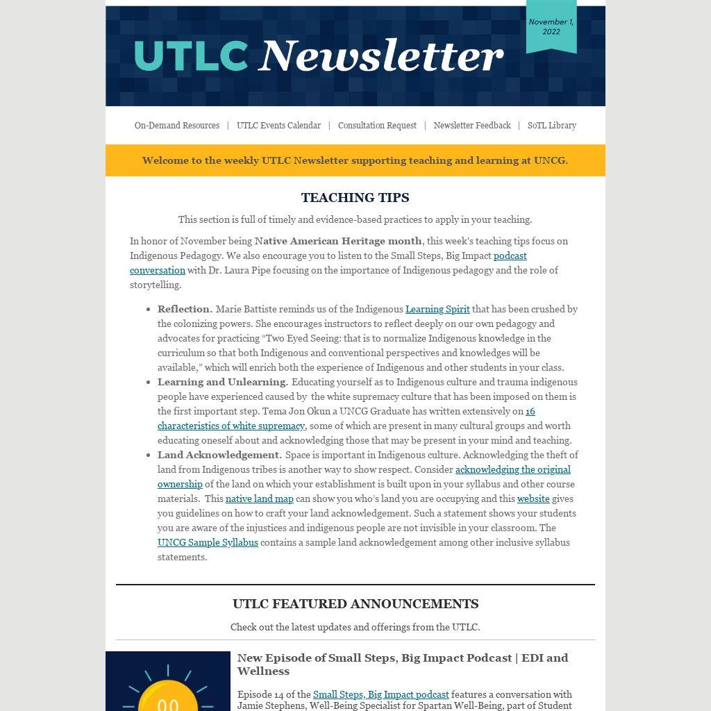 Welcome to the weekly UTLC Newsletter supporting teaching and learning at UNCG.
