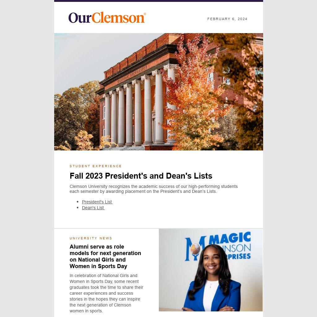 Clemson University recognizes the academic success of our high-performing students each semester by awarding placement on the President’s and Dean’s Lists.