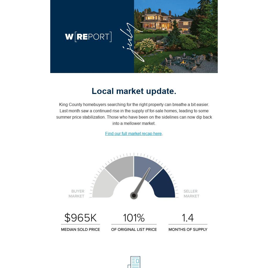 King County homebuyers searching for the right property can breathe a bit easier. Last month saw a continued rise in the supply of for-sale homes, leading to some summer price stabilization. Those who have been on the sidelines can now dip back into a mellower market.