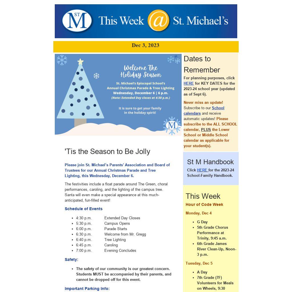 Please join St. Michael’s Parents’ Association and Board of Trustees for our Annual Christmas Parade and Tree Lighting, this Wednesday, December 6.