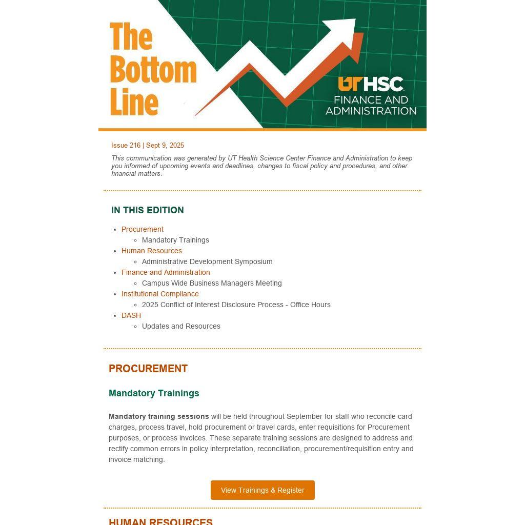 This communication was generated by UT Health Science Center Finance and Administration to keep you informed of upcoming events and deadlines, changes to fiscal policy and procedures, and other financial matters.
