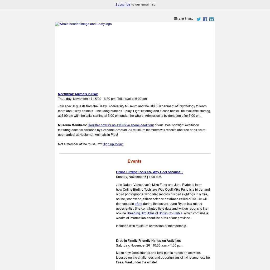 Join special guests from the Beaty Biodiversity Museum and the UBC Department of Psychology to learn more about why animals – including humans – play! Light catering and a cash bar will be available starting at 5:00 pm with the talks starting at 6:00 pm under the whale. Admission is by donation after 5:00 pm.