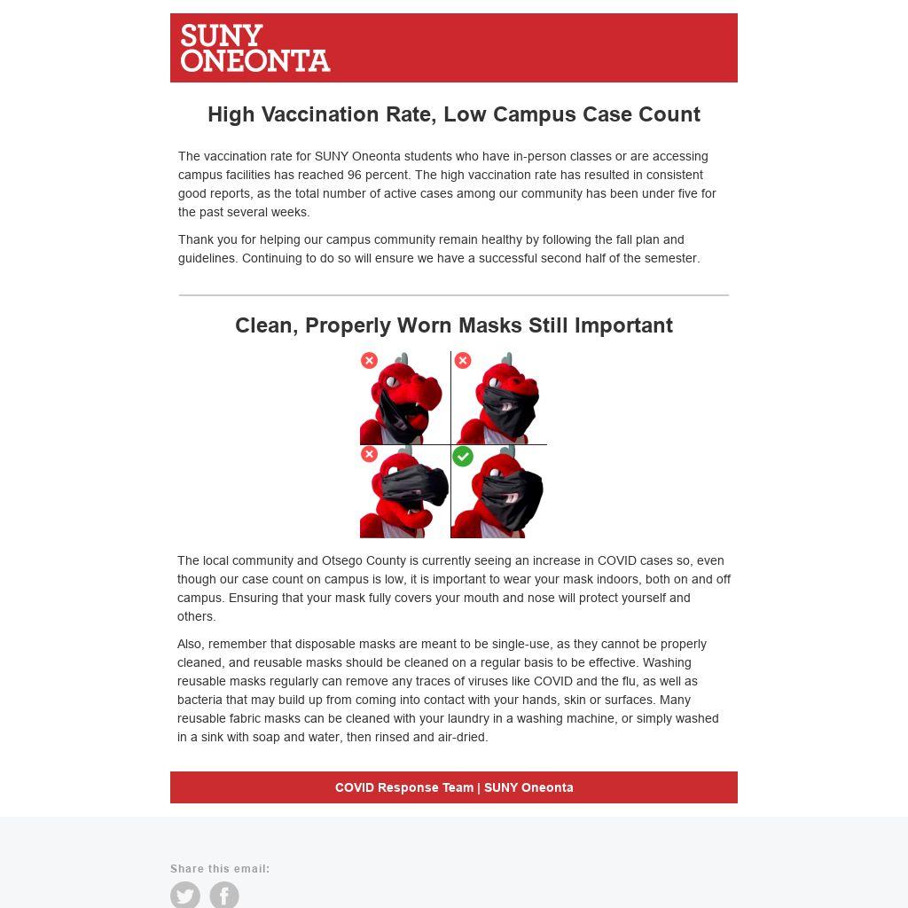 The local community and Otsego County is currently seeing an increase in COVID cases so, even though our case count on campus is low, it is important to wear your mask indoors, both on and off campus. Ensuring that your mask fully covers your mouth and nose will protect yourself and others.