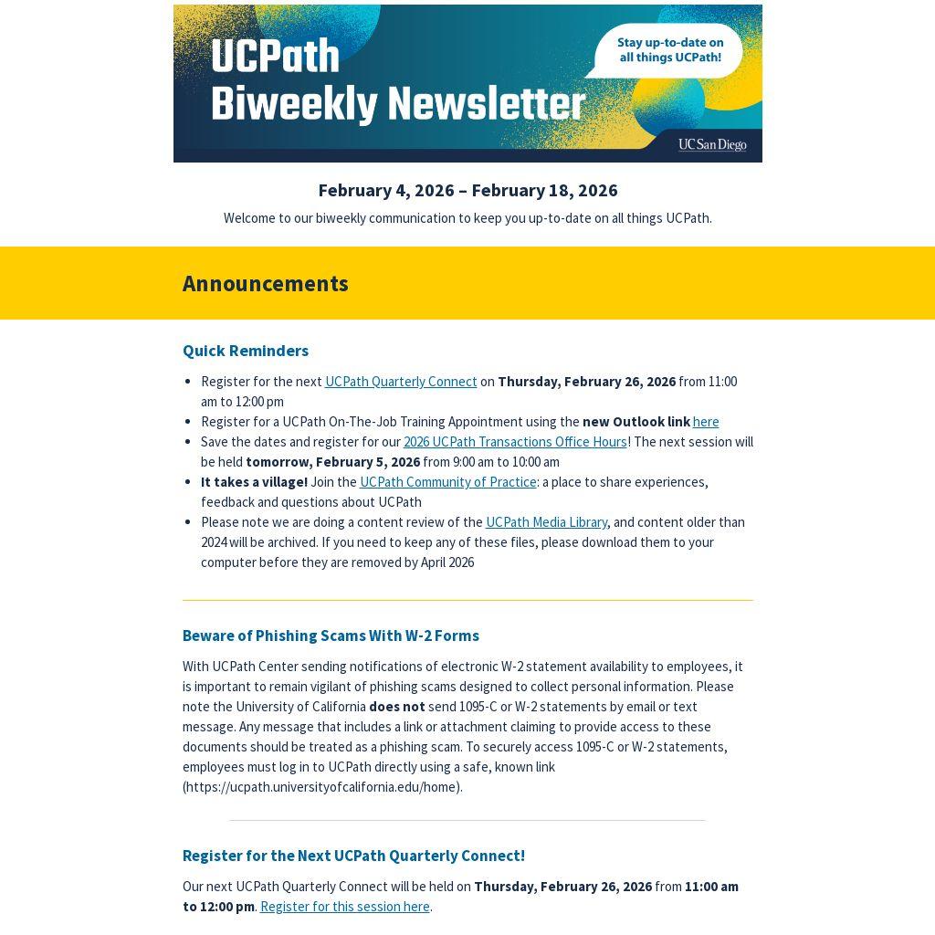 - Register for the next UCPath Quarterly Connect on Thursday, February 26, 2026 from 11:00 am to 12:00 pm