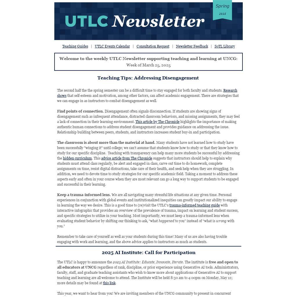 Welcome to the weekly UTLC Newsletter supporting teaching and learning at UNCG: