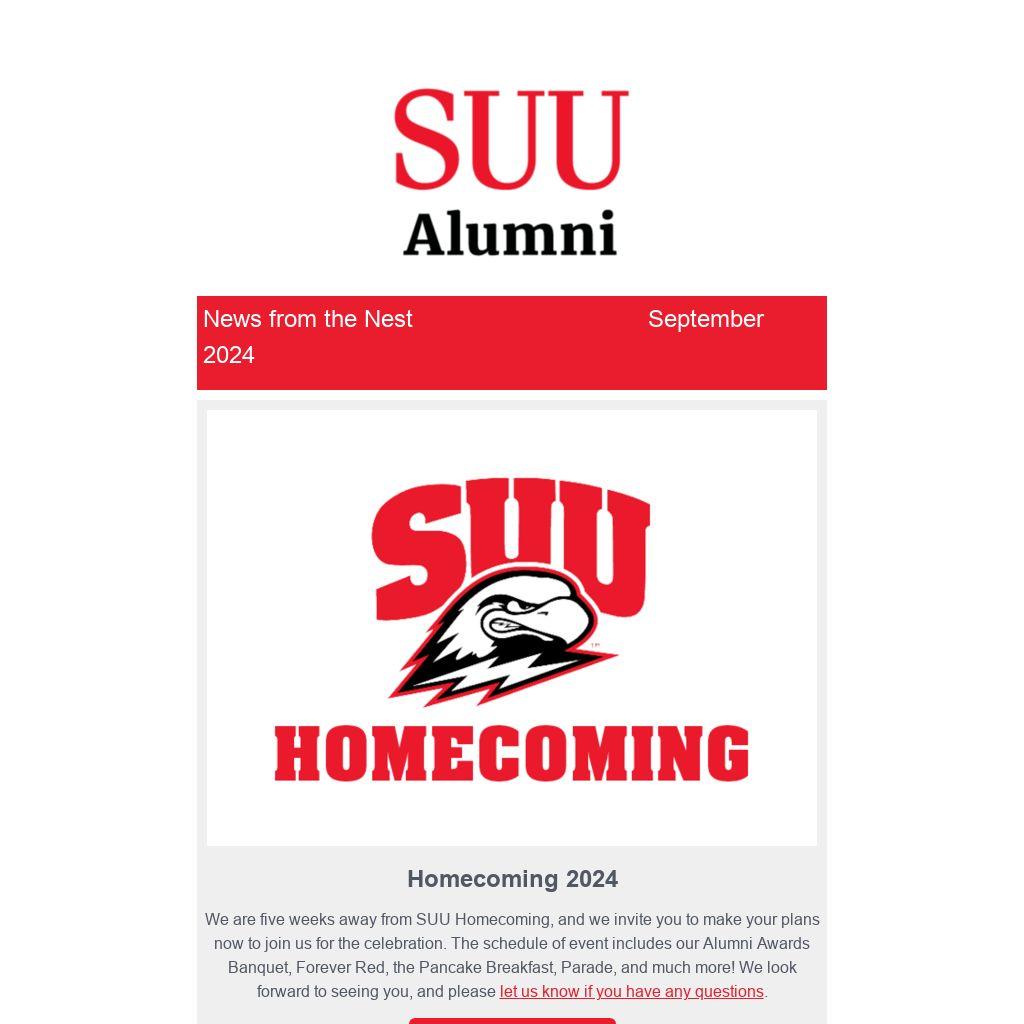 We are five weeks away from SUU Homecoming, and we invite you to make your plans now to join us for the celebration. The schedule of event includes our Alumni Awards Banquet, Forever Red, the Pancake Breakfast, Parade, and much more! We look forward to seeing you, and please let us know if you have any questions.