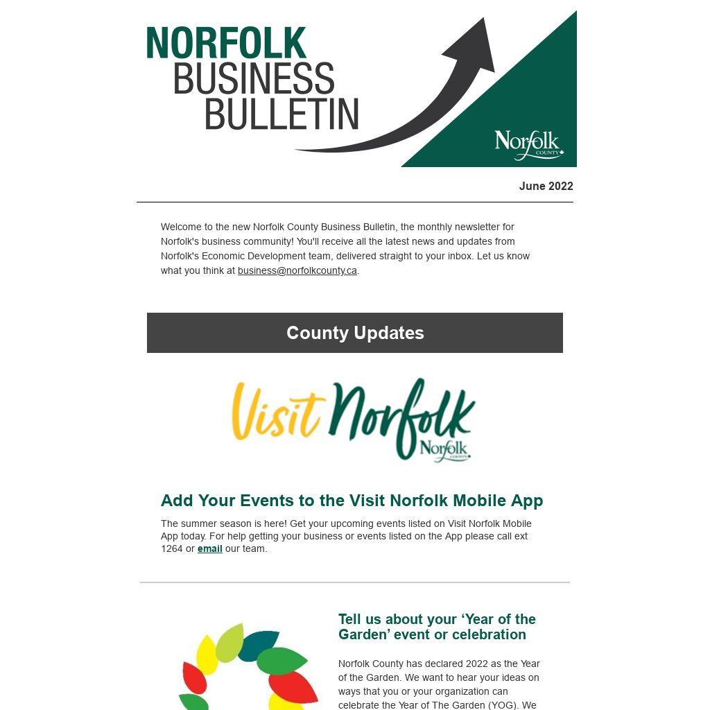 Welcome to the new Norfolk County Business Bulletin, the monthly newsletter for Norfolk's business community! You'll receive all the latest news and updates from Norfolk's Economic Development team, delivered straight to your inbox. Let us know what you think at business@norfolkcounty.ca.