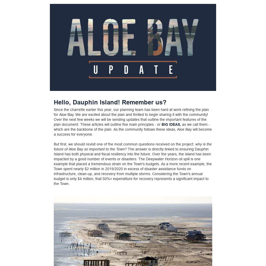 Looking back, Town Leadership began to recognize these vulnerabilities and the need for physical and fiscal sustainability many years ago; Hurricane Katrina being the "final trigger" leading to the Dauphin Island Strategic Plan, adopted in 2007. As part of that plan, a town center was envisioned along Aloe Bay that included revitalizing a true working waterfront which builds upon the past and creates a small mixed-use area with commercial fishing, eco-tourism activities, housing and retail space. This represented a significant consideration by the community to recognize Aloe Bay as a point of economic sustainability for the Town in the future. The vision was carried forward in the Town’s Comprehensive Plan 2030 by including ideas like a network of boardwalks, observation points, and a marina. Following the Deepwater Horizon oil spill in 2010, the Town decided to leverage these ideas as part of a funding request to the Alabama Gulf Coast Recovery Council, resulting in the Town being awarded over $16.5 million for physical improvements to make this vision a reality through the Aloe Bay Town Center Master Plan.
