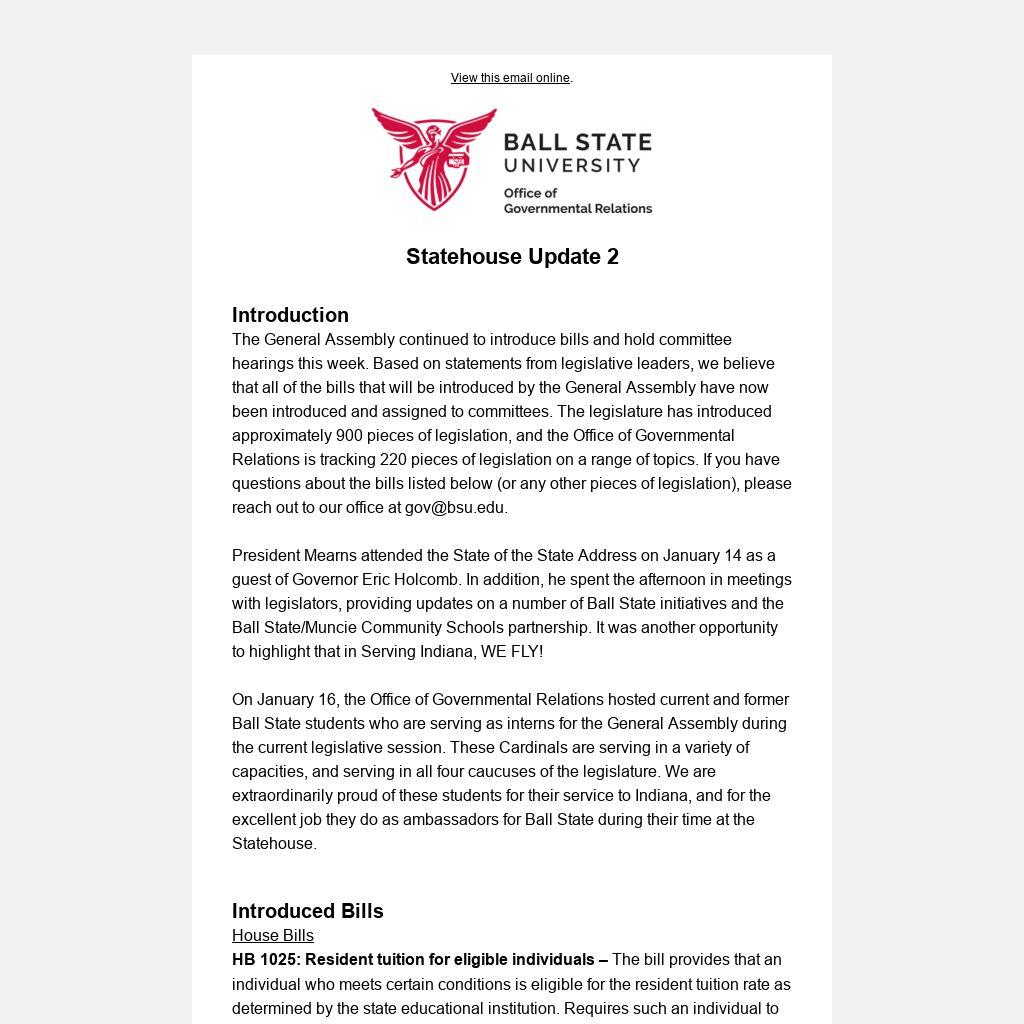 The General Assembly continued to introduce bills and hold committee hearings this week. Based on statements from legislative leaders, we believe that all of the bills that will be introduced by the General Assembly have now been introduced and assigned to committees. The legislature has introduced approximately 900 pieces of legislation, and the Office of Governmental Relations is tracking 220 pieces of legislation on a range of topics. If you have questions about the bills listed below (or any other pieces of legislation), please reach out to our office at gov@bsu.edu.