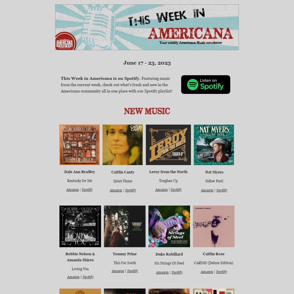 This Week in Americana is on Spotify. Featuring music from the current week, check out what's fresh and new in the Americana community all in one place with our Spotify playlist!