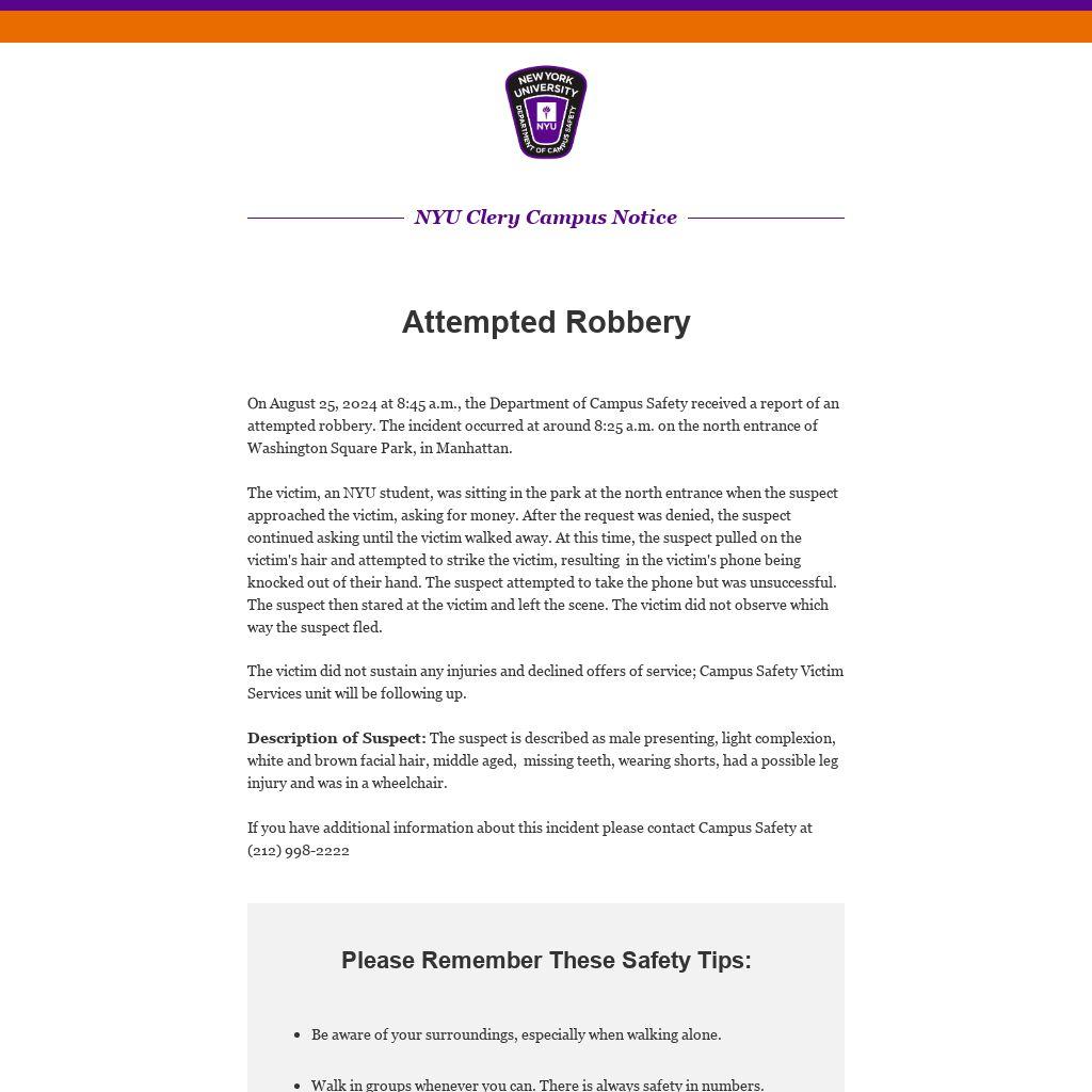On August 25, 2024 at 8:45 a.m., the Department of Campus Safety received a report of an attempted robbery. The incident occurred at around 8:25 a.m. on the north entrance of Washington Square Park, in Manhattan.