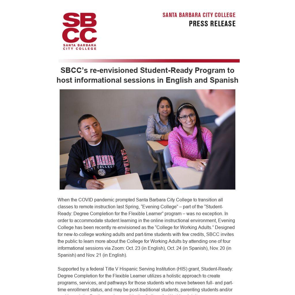 When the COVID pandemic prompted Santa Barbara City College to transition all classes to remote instruction last Spring, “Evening College” – part of the “Student-Ready: Degree Completion for the Flexible Learner” program – was no exception. In order to accommodate student learning in the online instructional environment, Evening College has been recently re-envisioned as the “College for Working Adults.” Designed for new-to-college working adults and part-time students with few credits, SBCC invites the public to learn more about the College for Working Adults by attending one of four informational sessions via Zoom: Oct. 23 (in English), Oct. 24 (in Spanish), Nov. 20 (in Spanish) and Nov. 21 (in English).