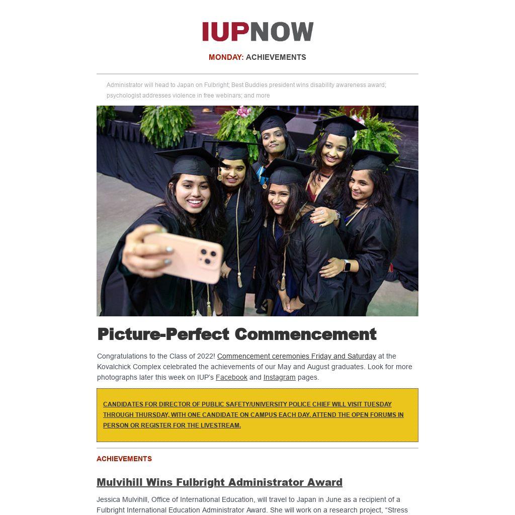 Distributed to IUP employees and students three days a week, IUP Now is the official newsletter of Indiana University of Pennsylvania. It features news from across the IUP website, compiled by the Division of Marketing and Communications. Find out how to get your news and events in IUP Now.