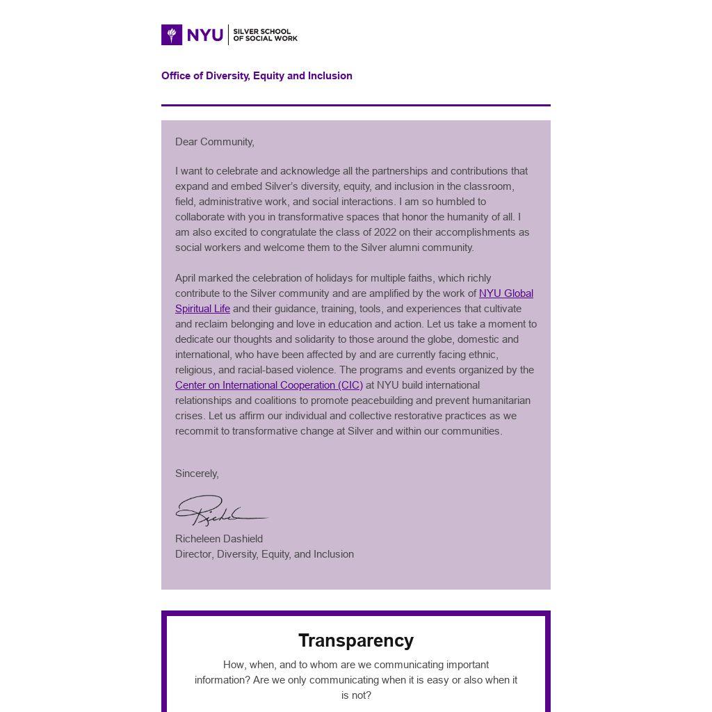 April marked the celebration of holidays for multiple faiths, which richly contribute to the Silver community and are amplified by the work of NYU Global Spiritual Life and their guidance, training, tools, and experiences that cultivate and reclaim belonging and love in education and action. Let us take a moment to dedicate our thoughts and solidarity to those around the globe, domestic and international, who have been affected by and are currently facing ethnic, religious, and racial-based violence. The programs and events organized by the Center on International Cooperation (CIC) at NYU build international relationships and coalitions to promote peacebuilding and prevent humanitarian crises. Let us affirm our individual and collective restorative practices as we recommit to transformative change at Silver and within our communities.