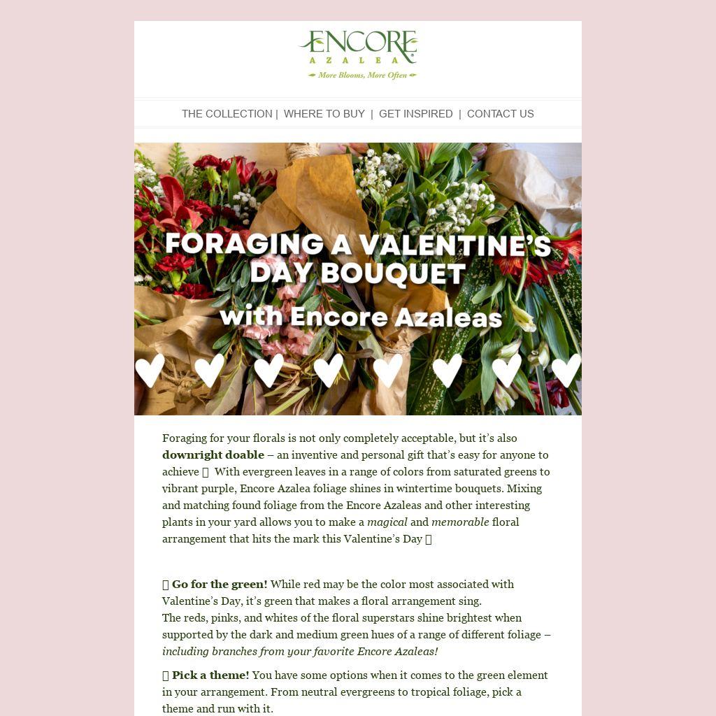 🌿 Go for the green! While red may be the color most associated with Valentine’s Day, it’s green that makes a floral arrangement sing. The reds, pinks, and whites of the floral superstars shine brightest when supported by the dark and medium green hues of a range of different foliage – including branches from your favorite Encore Azaleas!