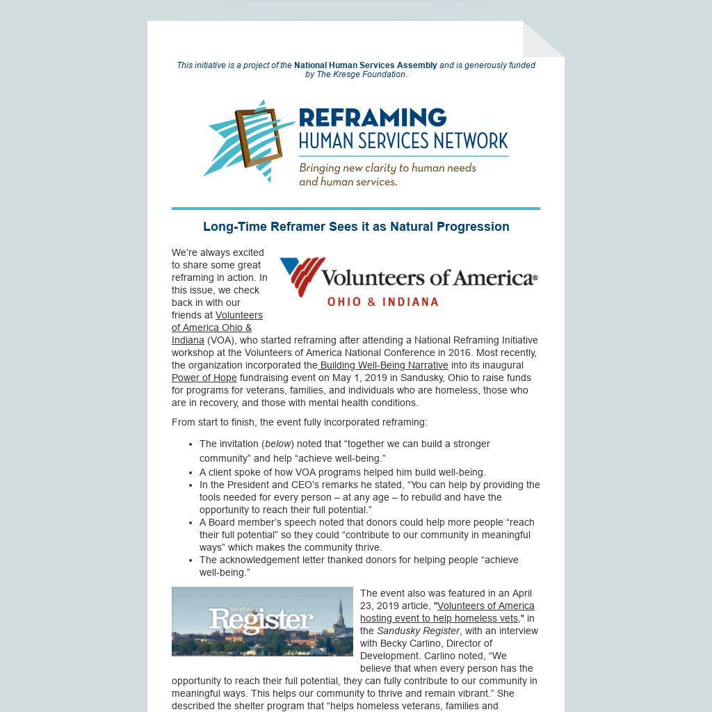 | We’re always excited to share some great reframing in action. In this issue, we check back in with our friends at Volunteers of America Ohio & Indiana (VOA), who started reframing after attending a National Reframing Initiative workshop at the Volunteers of America National Conference in 2016. Most recently, the organization incorporated the Building Well-Being Narrative into its inaugural Power of Hope fundraising event on May 1, 2019 in Sandusky, Ohio to raise funds for programs for veterans, families, and individuals who are homeless, those who are in recovery, and those with mental health conditions.