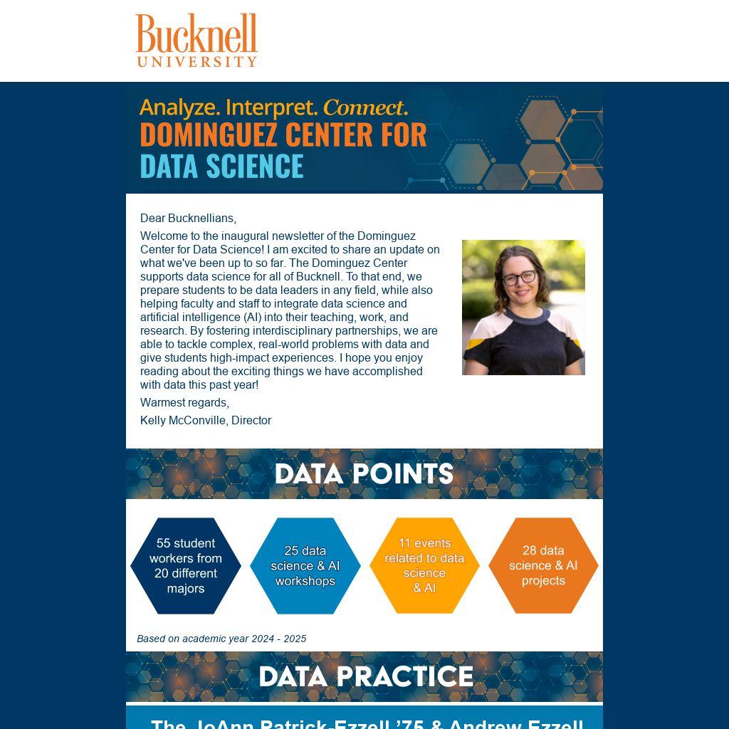 Welcome to the inaugural newsletter of the Dominguez Center for Data Science! I am excited to share an update on what we've been up to so far. The Dominguez Center supports data science for all of Bucknell. To that end, we prepare students to be data leaders in any field, while also helping faculty and staff to integrate data science and artificial intelligence (AI) into their teaching, work, and research. By fostering interdisciplinary partnerships, we are able to tackle complex, real-world problems with data and give students high-impact experiences. I hope you enjoy reading about the exciting things we have accomplished with data this past year!