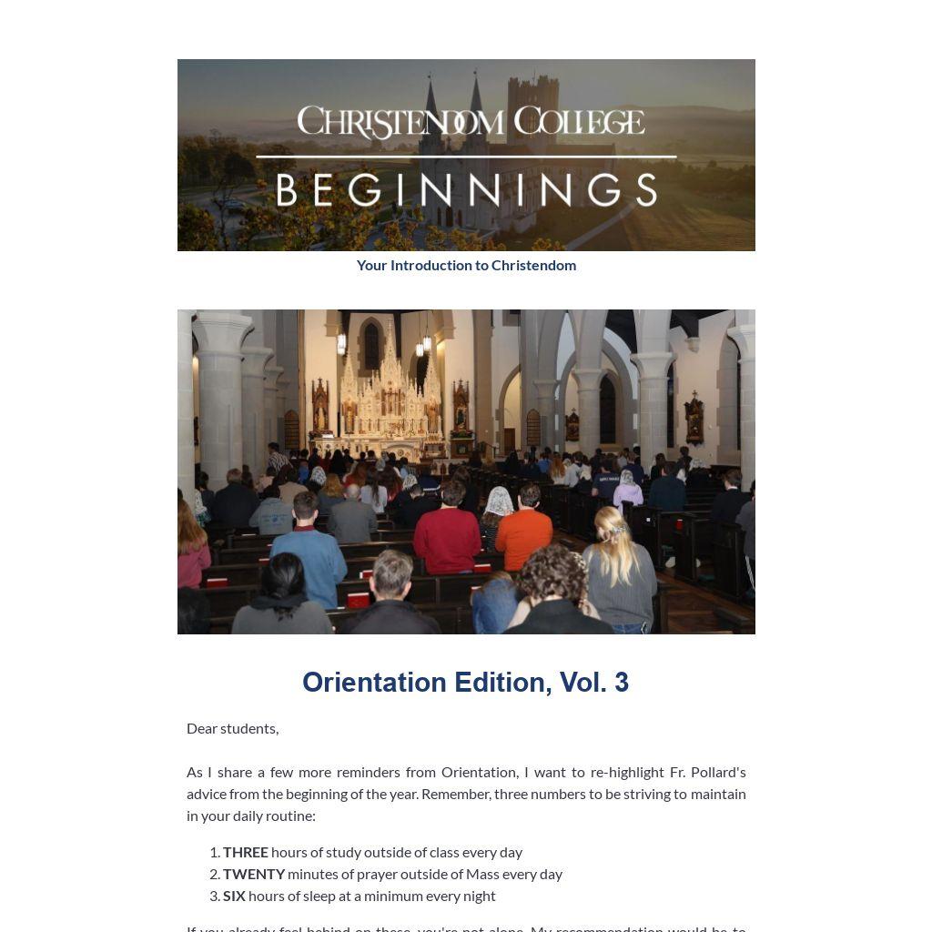 As I share a few more reminders from Orientation, I want to re-highlight Fr. Pollard's advice from the beginning of the year. Remember, three numbers to be striving to maintain in your daily routine: