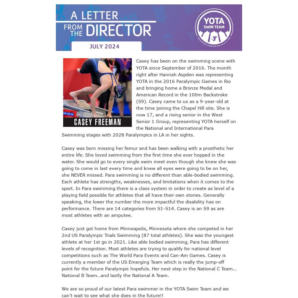 A week later, Casey attended her 2nd US Paralympic Team Trials at the University of Minnesota. She waas one of only 87 Para athletes in the country to qualify for this prestigious event. She swam 5 events, and made finals in 4 of them. She was able to pull 3 best times and bettered her morning time in almost every race. She placed 6th in the 100 Back, 5th in the 400 Free, 7th in the 200 IM, and 6th in the 50 Free. The event was televised on Peacock and is still streaming there if you are interested in seeing her dawn the YOTA cap!