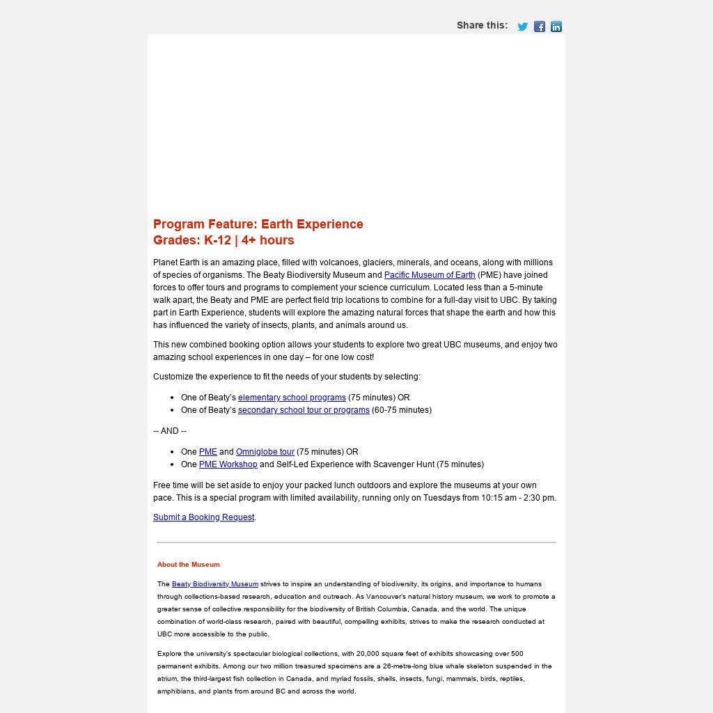 Pacific Museum of Earth (PME) have joined forces to offer tours and programs to complement your science curriculum. Located less than a 5-minute walk apart, the Beaty and PME are perfect field trip locations to combine for a full-day visit to UBC. By taking part in Earth Experience, students will explore the amazing natural forces that shape the earth and how this has influenced the variety of insects, plants, and animals around us.
