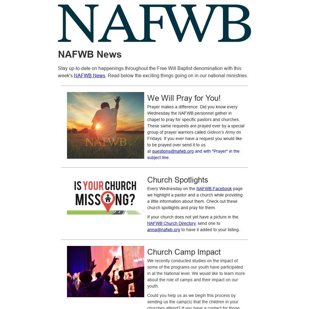 Could you help us as we begin this process by sending us the camp(s) that the children in your churches attend? If you have a contact for those camps, that would be helpful as well. Please email your information to questions@nafwb.org with "Camp" in the subject line.