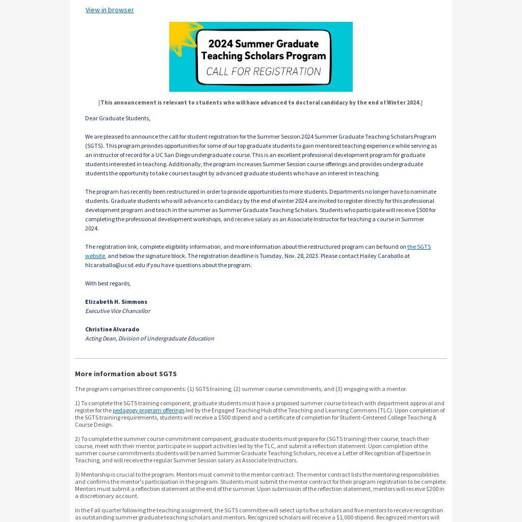The registration link, complete eligibility information, and more information about the restructured program can be found on the SGTS website, and below the signature block. The registration deadline is Tuesday, Nov. 28, 2023. Please contact Hailey Caraballo at hlcaraballo@ucsd.edu if you have questions about the program.