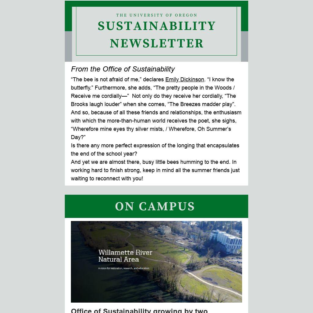 The Office of Sustainability cannot wait to introduce you to two new members of our team—the Energy Program Specialist and the UO’s first Campus Natural Areas Steward. The Energy Program Specialist will round out the office’s Energy Analysis team. The new position of Steward will oversee restoration and engagement work on the university’s natural areas, including bringing to life the goals and vision of the Willamette River Natural Area management plan. Watch for formal introductions in the summer edition of this newsletter.