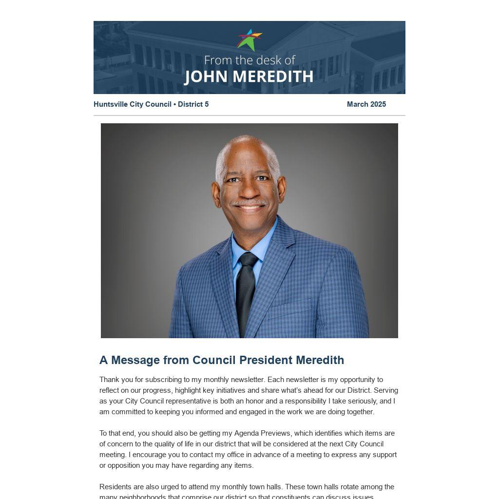 Join Council President Meredith for the District 5 Town Hall on Thursday, March 20, at 6 p.m. at Hope Church, 1661 Balch Road. The topic will be on education, and he will be joined by Carlos Mathews, President of the Huntsville City Schools Board.